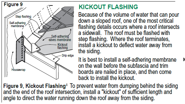 Siding too close to roof plane. Wrongly detailed kick-out Gutter too close to siding. 1″ minimum clearance.
